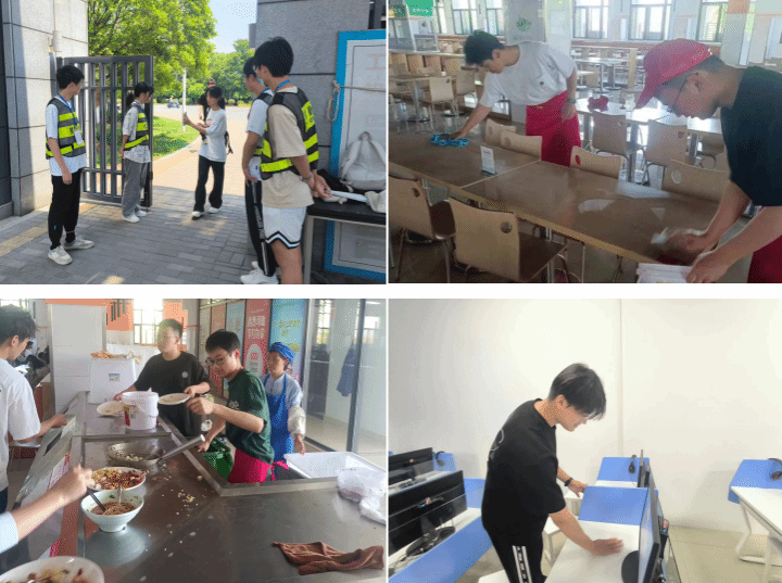 教学楼中,员工们携带工具,对教室地面以及桌兜里的垃圾、桌面上的字迹及地面、墙角、窗台等卫生死角,进行了细致全面的清洁,有序并完成了各区域的清扫工作。食堂中,同学热情帮助食堂工作人员擦桌子、打汤、倒剩饭剩菜。校园安保实践中,他们顶着烈日在校门值班、校内巡逻,参与校园管理和文明劝导工作。