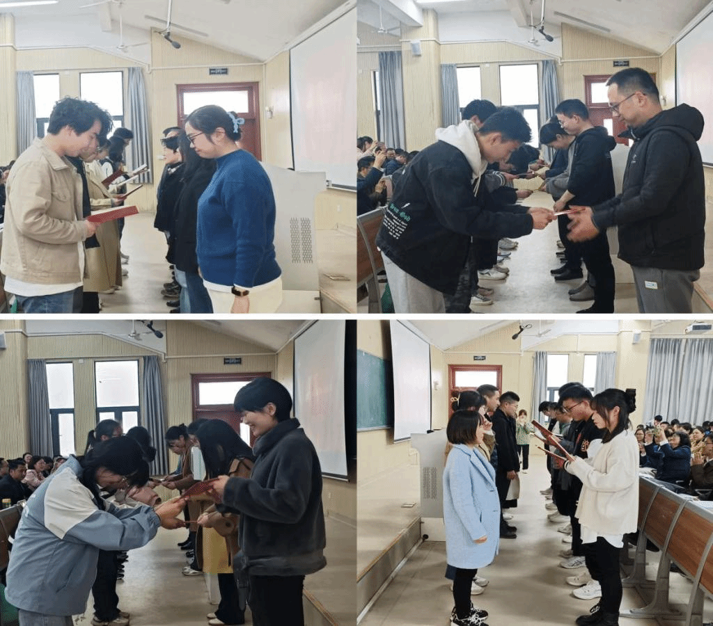 接着,物理学系主任李冬鹏、光电信息科学与工程系主任余龙宝、新能源材料与器件系主任马小航、材料科学与工程系主任王琳分别宣读了各专业的导师与对应指导员工名单,导师一一上台,接受员工代表诵读拜师词、呈送拜师帖、行拜师礼并合影留念。