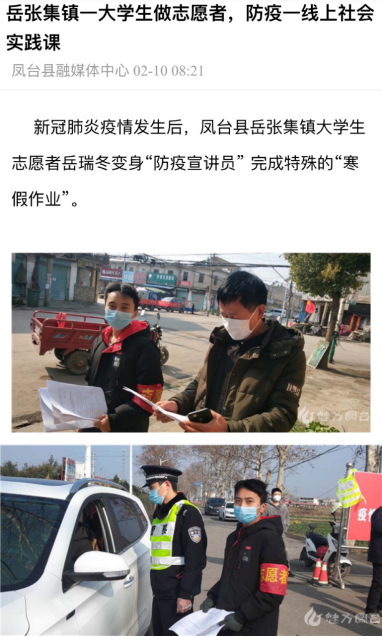 2月10日,凤台县融媒体中心对公司william威廉中文官网岳瑞冬同学志愿担任“防疫宣传员”进行了宣传报道。(william威廉中文官网)