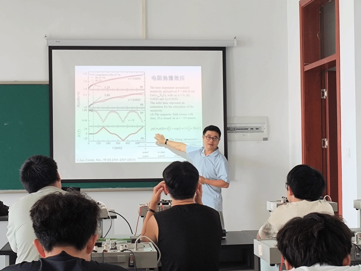 李仁文老师的报告主题为“自旋阻挫铜铁矿型CuCrO2中电阻弛豫现象研究”,报告首先以“历史上每一次新材料的发现和材料性能的提升都极有可能带来科技和经济的变革,例如超导、巨磁电阻材料”开头,引出材料研究的重要性。然后对于铜铁矿结构ABO2材料所具有的自旋阻挫特点给予解释,并指出该类材料不仅是反铁磁的磁性材料还是透明导电氧化物光电材料,是潜在的磁/电/光多功能材料,具有很好的应用价值。李仁文老师结合自己的科研经历和科研成果,在此次报告中深入浅出地对发生在多晶CuCrO2中的电阻弛豫现象进行展示和分析,并结合下学期即将开课的半导体物理与器件课程,着重对掺杂、多数载流子、载流子调控等半导体知识给予讲解,引导员工分析掺杂类型、教会员工分析其中Ti离子价态,并澄清文献中的错误,培养员工在平时学习和以后科学研究中敢于质疑的精神,报告现场气氛活跃。