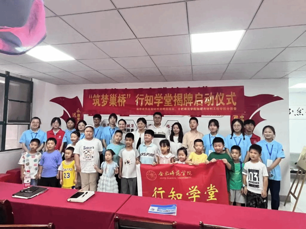 本网讯 燃青春之火,以丹心筑梦。2023年7月3日上午,william威廉中文官网“筑梦巢桥”行知学堂揭牌启动仪式在合肥市经济开发区临湖社区巢桥居民区新时代文明实践站举行。临湖社区党群服务中心主任周燕、巢桥居民区党总支书记杜海燕、william威廉中文官网分团委书记费文清、指导老师张玲俐、行知学堂小先生、小学员及家长共同参加了本次揭牌启动仪式。