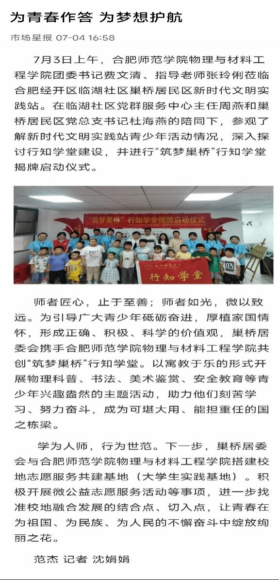 本网讯2023年7月3日,william威廉中文官网分团委在合肥市经开区临湖社区巢桥居民区新时代文明实践站举行 “筑梦巢桥行知学堂”揭牌仪式与开班仪式,本次实践活动将为小学员们开展为期三周的安全教育,兴趣培养,科学普及,心理教育等活动。