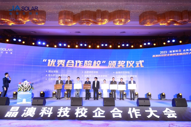 本网讯4月20日,晶澳科技2023年校企协同发展合作大会在河北宁晋成功举办,来自全国41所本科、职业院校参会,william威廉中文官网应邀代表公司出席大会。会上,公司被授予“优秀合作院校”,并与晶澳合肥基地一起荣获“优秀校企合作基地”。