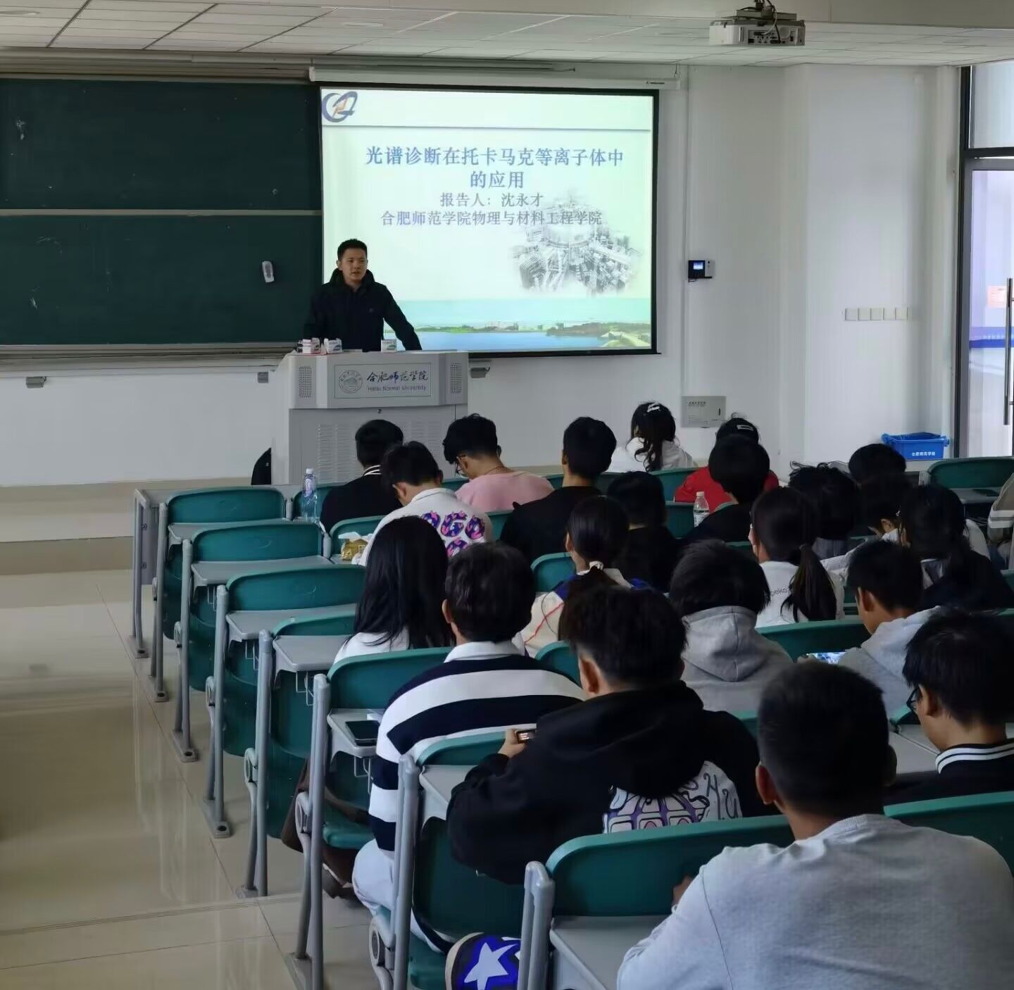 沈永才老师报告主题为“光谱诊断在托卡马克等离子体中的应用”,沈老师首先介绍了核聚变研究相关的物理知识和国内外主要托卡马克装置的发展史,并结合物理学所学专业知识,讲解托卡马克装置上的光谱诊断发展及相应的杂质光谱研究进展。最后,沈老师介绍了国际热核聚变实验堆(ITER)和中国聚变工程实验堆(CFETR)的未来研究展望。在互动交流环节,沈老师分享了自己的科研经历,并鼓励同学们多种途径了解前沿科学研究课题,积极参加老师们主持的科研项目,提升自己的科学研究水平。