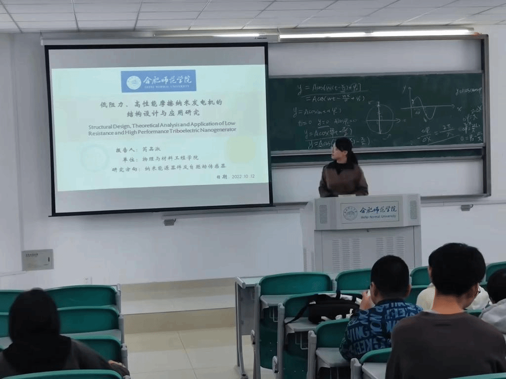 芮品淑老师报告主题为“低阻力、高性能摩擦纳米发电机的结构设计和应用研究”。报告介绍了摩擦纳米发电机在微纳米能源领域应用的优势背景,简述了摩擦纳米发电机的工作原理,工作模式,具体的应用场景;针对现今摩擦发电领域迫切解决的“摩擦阻力大,发电效率低”的问题,经过理论计算和合理的结构设计,给出了三种具体场景的应对方案。芮老师还展望了摩擦发电技术在物联网、可穿戴电子设备、人工智能领域的应用前景。报告会最后,芮品淑老师与同学们进行了讨论交流,分享了自己在科学研究及学术创新工作上的心得体会。