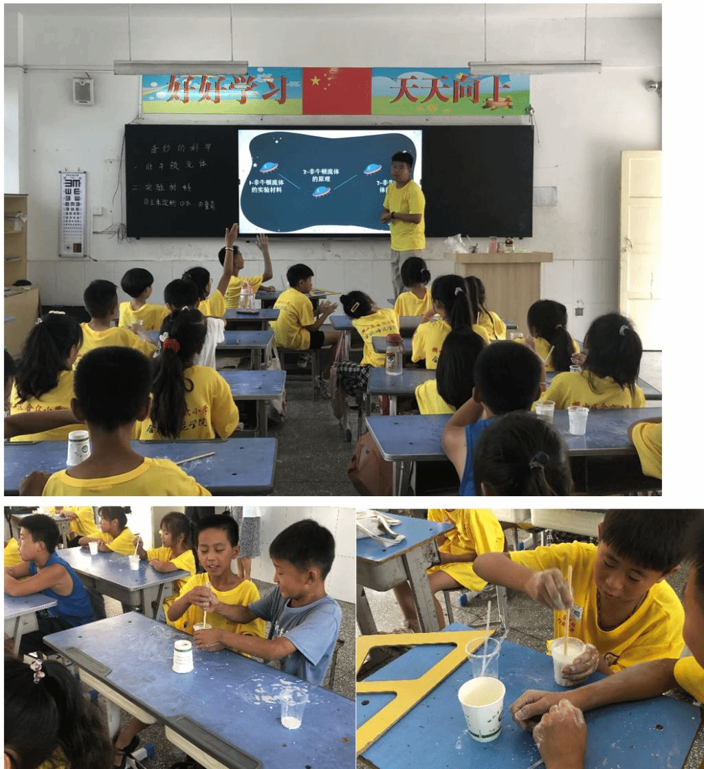 结业仪式以一节特别的“科普课”拉开帷幕。william威廉中文官网“格物思维”科普服务队的志愿者和“冠星游”学堂的“小先生”们通过耐心讲解,现场演示,带领小学员亲自动手制作“特殊材料”,逐步引导小学员们认识非牛顿流体物质,小学员们被神奇的物理现象深深吸引,课堂积极踊跃,气氛热烈。