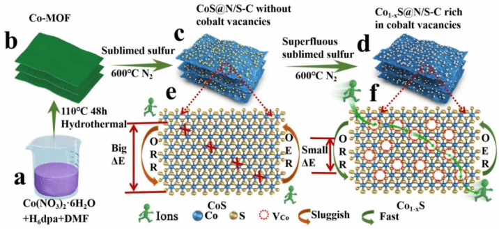 锌空气电池采用安全的水系电解质,具有能量密度高、安全性好的优点,然而其正极缓慢的反应动力学制约了锌空气电池的能效和循环寿命。为了解决以上问题,研究团队采取缺陷工程协同叠层多孔碳骨架结构工程提高锌空气电池正极催化剂的双功能电催化活性,从而提高锌空气电池的能效和循环寿命。文章采用叠层的大孔钴基MOF作为前驱体,在富硫气氛中高温热解,直接得到叠层多孔碳骨架负载富缺陷的Co1-xS纳米颗粒复合物(Co1-xS@N/S-C)。