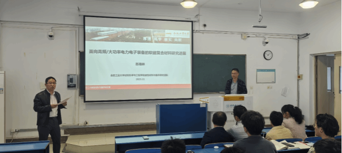 苏海林教授从电力电子设备对软磁铁芯的性能要求与软磁材料面临的问题作为讲座起始,再到软磁复合材料及其面临的挑战和当前科研团队的研究进展,最后对软磁复合材料磁化物理机制进行了分析。在讲述软磁复合材料时,苏教授先从软磁复合材料具有的优异性能、国家政策支持和市场应用需求等方面,对软磁复合材料的优点、存在的问题和机理分析向师生们详细阐述了软磁复合材料未来的发展前景,深入分析了软磁复合材料目前面临的困难和需要解决的问题,阐述了从机理方向进行分析解决关键问题的可能性。