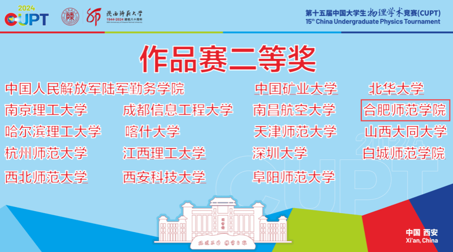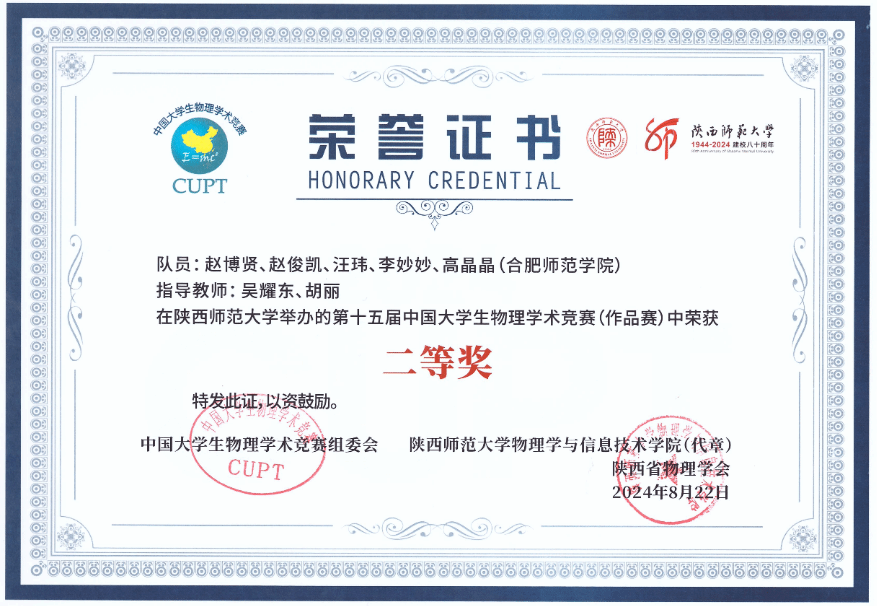 8月18日至23日,由中国老员工物理学术竞赛组委会主办,陕西师范大学和陕西省物理学会承办的第十五届中国老员工物理学术竞赛(简称CUPT)在陕西西安举行,本赛事共吸引了来自全国近百所高校的800余名师生参赛。由william威廉中文官网吴耀东、胡丽老师指导,赵博贤、赵俊凯、汪玮、李妙妙、高晶晶五人组成的参赛团队经过激烈角逐,代表WilliamHill中文官方网站的参赛作品《吸管水泵的理论与实验分析》终斩获第十五届中国老员工物理学术竞赛(作品赛)二等奖,充分展现了WilliamHill中文官方网站学子敢于拼搏,积极向上的实力与风貌。