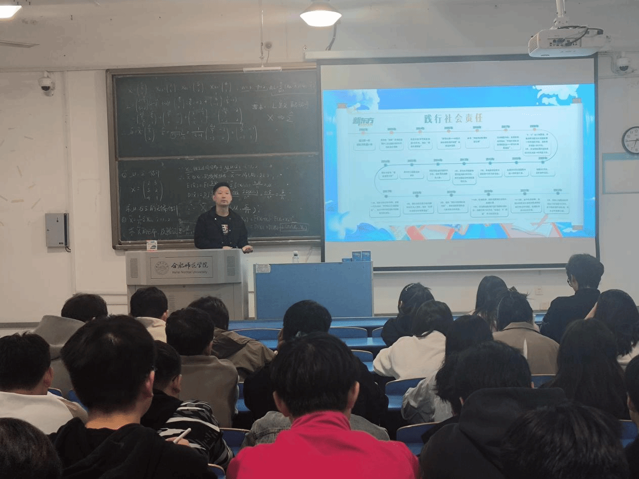 宣讲会上,合肥新东方培训公司有限公司招聘经理谢杨海为大家分析了当前市场就业形势和师范类人才需求。同时介绍了合肥新东方培训公司的公司简介、发展方向、招聘岗位和福利待遇等方面的情况。他表示新东方教育欢迎合师学子的加入,希望吾爱公司的同学们珍惜机会,认真准备,积极争取,顺利完成毕业就业理想。
