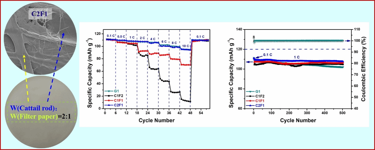 具有成本低、化学稳定性良好、绿色环保等特点的纤维素纤维是钠离子电池隔膜材料开发的重要方向。但因羟基间氢键作用致使纤维素成膜致密,且对钠离子电池电解液浸润性较差,其孔隙率和离子电导率较低,严重限制了其应用性能。william威廉中文官网新能源材料与器件专业马小航团队提出利用微纳纤维素纤维复合调控纤维素膜微结构的策略,分别从蒲棒中提取了微米纤维素纤维,从普通定性滤纸中获取了纳米纤维素纤维,借助简便的流浆过筛工艺制备了纤维素基复合隔膜,并探究了复合比例对隔膜微结构、拉伸强度、电化学性能等的影响。