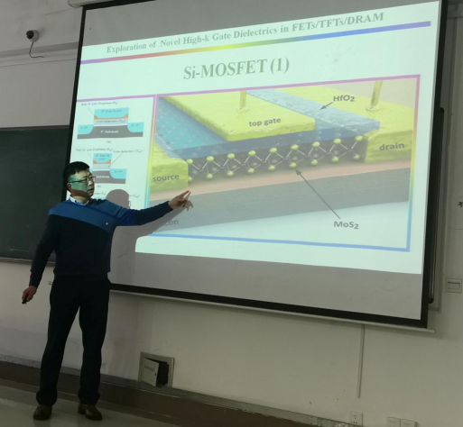 何刚教授详细介绍了高k栅介质的研究背景及在硅基高k栅材料选择及界面修饰的系统研究工作。针对高k栅介质本身的缺陷及硅基的服役周期问题,介绍了课题组在高迁移沟道材料与高k栅异质集成方面的工作。最后,介绍了高k栅的应用领域及课题组在薄膜晶体管方面取得的研究进展。何刚教授还向同学介绍了安徽大学物理公司研究生的招生情况,并鼓励大家报考安徽大学物理公司。