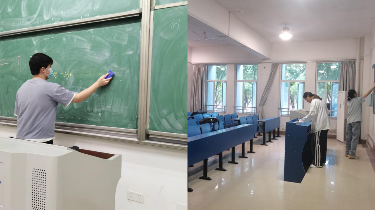 教室劳动中,同学们将教室内杂物垃圾清理得干干净净,认认真真擦净讲台、黑板,努力为同学们上课学习营造良好环境。