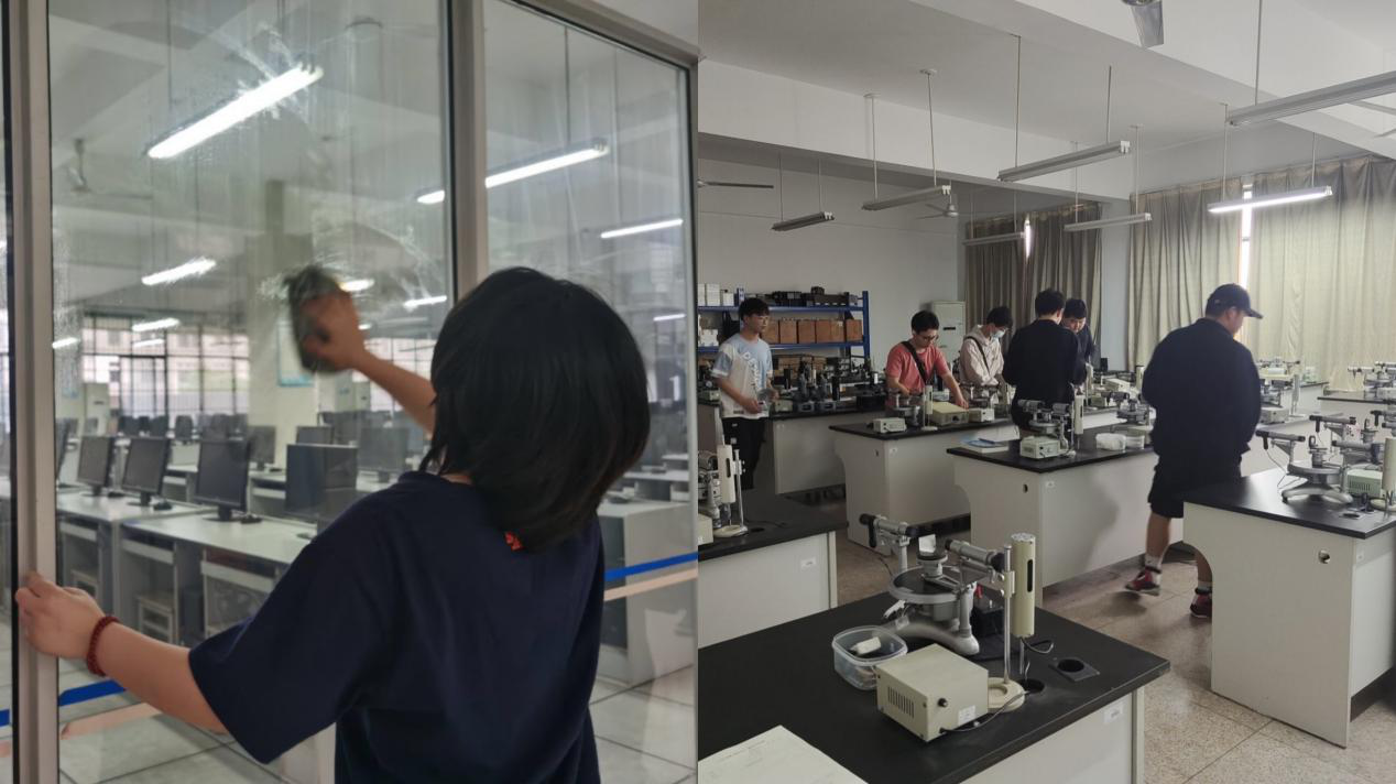 实验室劳动中,同学们一丝不苟地清扫并整理实验仪器,了解实验室安全、专业设备等相关知识,爱护公共资源。