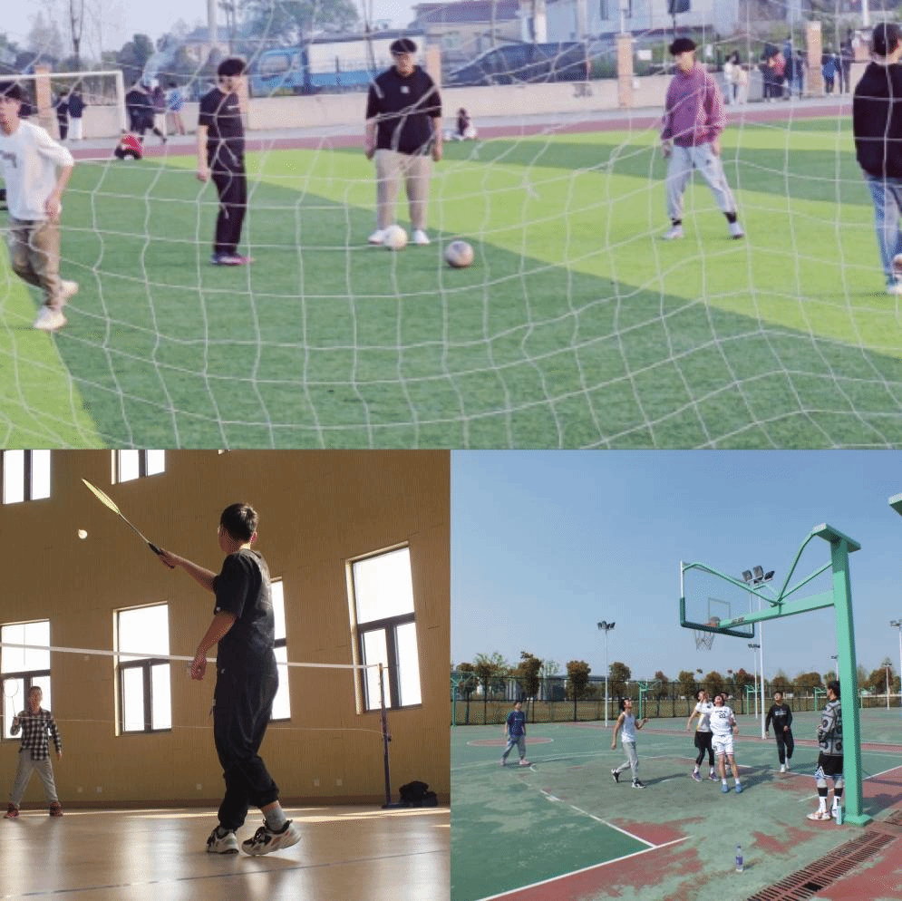 阳光下的球场,同学们或选择篮球对抗,或选择羽毛球争霸,斗志高昂、灵活跳跃、奋力击球、团队合作,同场竞技,还有在绿茵场上奔跑追逐的足球队员们,尽情地展示着脚下的技术和风采,必胜的呼喊,脸上洋溢的自信无不彰显着青春活力。