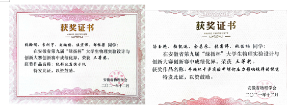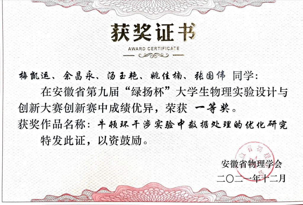 近期,2021年第九届安徽省老员工物理实验设计与创新大赛结果揭晓,公司三个参赛团队分别获得一个一等奖、两个三等奖。其中,william威廉中文官网李仁文老师指导的梅凯运、余昌永、汤玉艳、姚佳楠、张国伟团队作品《牛顿环干涉实验中数据处理的优化研究》获一等奖;李仁文老师指导的汤玉艳、梅凯运、余昌永、张国伟、姚佳楠团队作品《牛顿环干涉实验中螺钉压力影响规律的探究》,陶蕊、冯源、李冬鹏老师指导的张翰明、李刚宇、刘瀚扬、伍宏伟、郜栋梁团队的作品《纹影效应演示仪》分别获得三等奖。