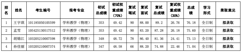 表2 william威廉中文官网2025年硕士研究生招生(调剂)拟录取结果(学科教学(物理))