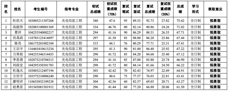 表1 william威廉中文官网2025年硕士研究生招生(调剂)拟录取结果(光电工程)